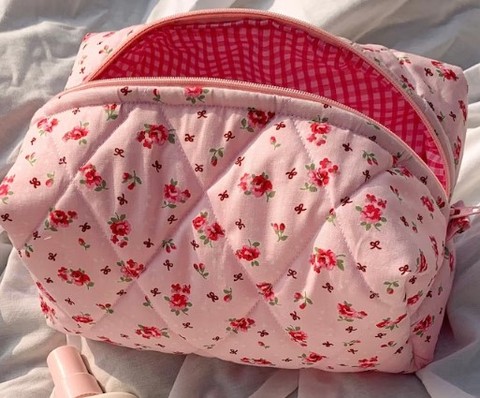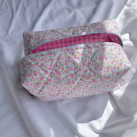Borsa per il trucco in cotone trapuntato floreale personalizzata borsa per cosmetici con fodera a quadretti rosa